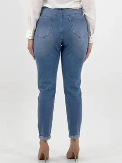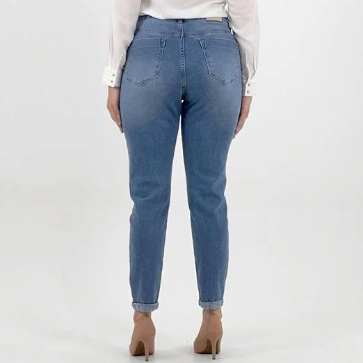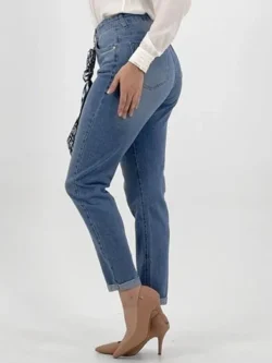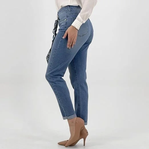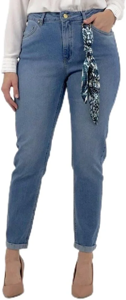 Calça Jeans Feminina Mom Young Style Inspiradas no estilo vintage das décadas passadas, essas calças têm uma modelagem única que as torna uma opção elegante e versátil para o guarda-roupa feminino moderno. DETALHES:-Calça feminina.Jeans Mom. Cós alto com passante para cinto. Fechamento frontal por zíper e botão. Detalhe em lenço removível parte frontal. -Três bolsos parte frontal e dois bolsos parte de trás. Logo da marca costurada na parte de trás do cós. Com costuras duplas de segurança parte interna. Possui um lindo lenço pra dá mais elegância a peça.