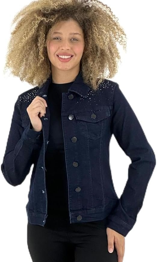 Jaqueta Jeans Feminina Young Style Um item de moda essencial que combina estilo, versatilidade. Esta jaqueta oferece um visual elegante e sofisticado sem comprometer o estilo. Uma adição indispensável ao guarda-roupa de qualquer mulher moderna. DETALHES: -Jaqueta feminina. -Jeans. -Gola colarinho. -Manga longa. -Fechamento no punho por botão metalizados. -Fechamento frontal em botões metalizados. -Dois bolsos frontais e dois bolsos na altura do busto, com lapela e fechamento em botões metalizado. -Detalhe na região dos ombro em aplicação de strass. -Com costura duplas de segurança interna e externa.